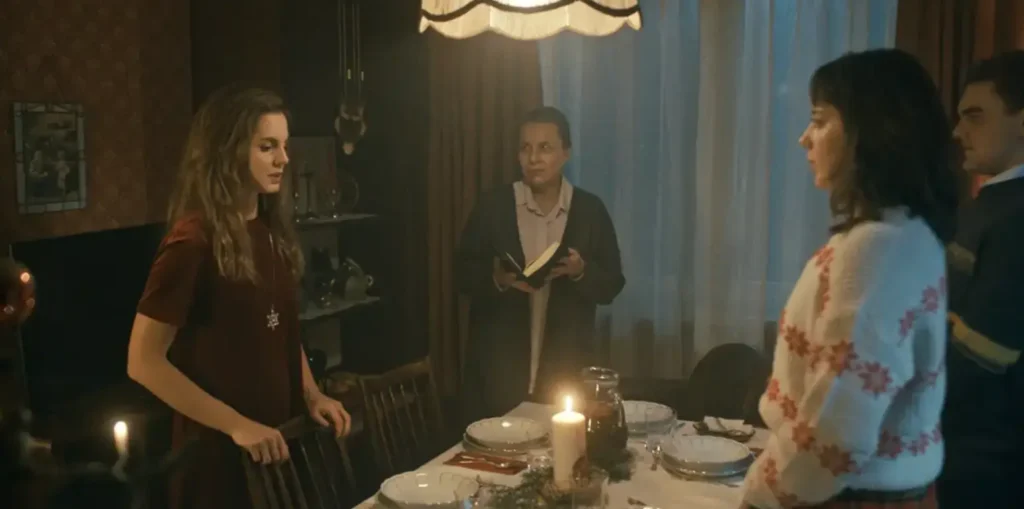 Biją też inni. Główna bohaterka zagrana w mocny sposób przez mało dotąd znaną Agatę Turkot uczy angielskiego online. Zwróćmy uwagę na to, że w zasadzie wszyscy jej uczniowie… pardon, uczennice ponoszą konsekwencje przemocy. Jest siostra zakonna opiekująca się maltretowanymi kobietami; jest bohaterka grana przez Julię Kijowską, która mówi, że jej partner podbija jej oko, gdyż dobrze wie, że wtedy ze wstydu nie wyjdzie ona z domu; jest nawet dziewczynka zajmująca się bitym psem.